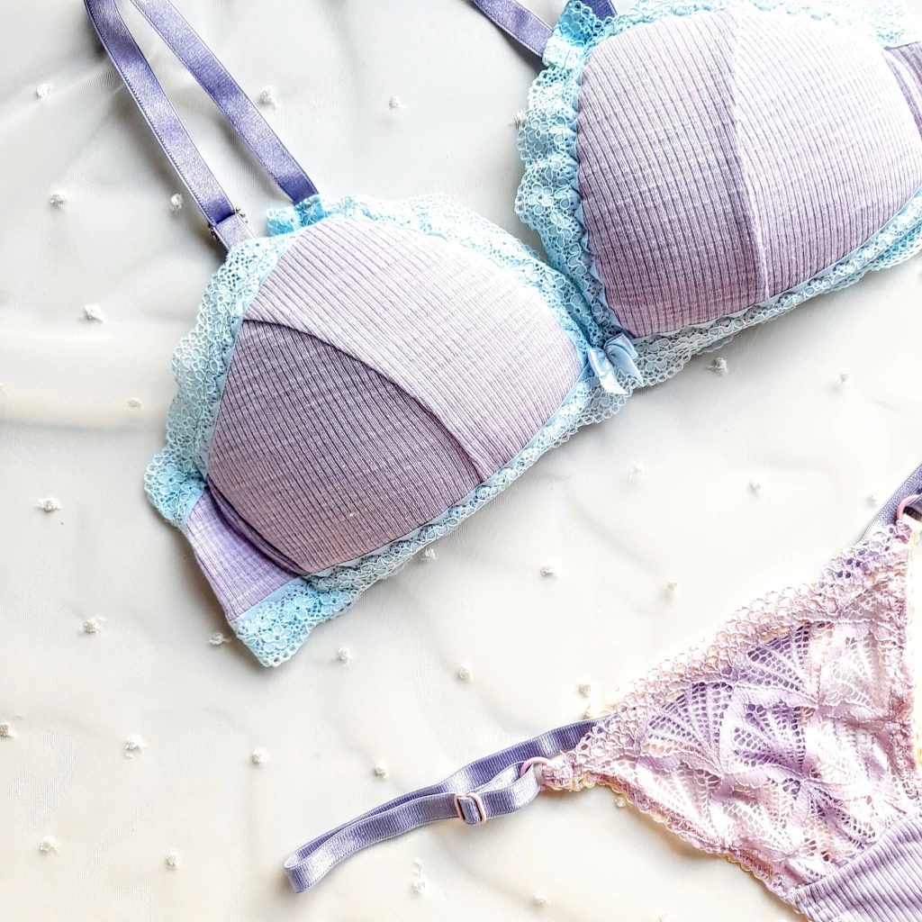 Conjunto en morley lila, puntillas celestes y elasticos al tono, corpiño con gancho de prender atraz con taza armada super suave y blanda que se adapta a tus formas perfectamente (bondeado) y bombacha regulable less en la misma tela.