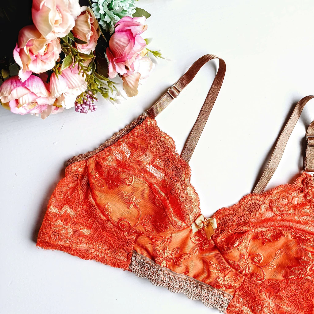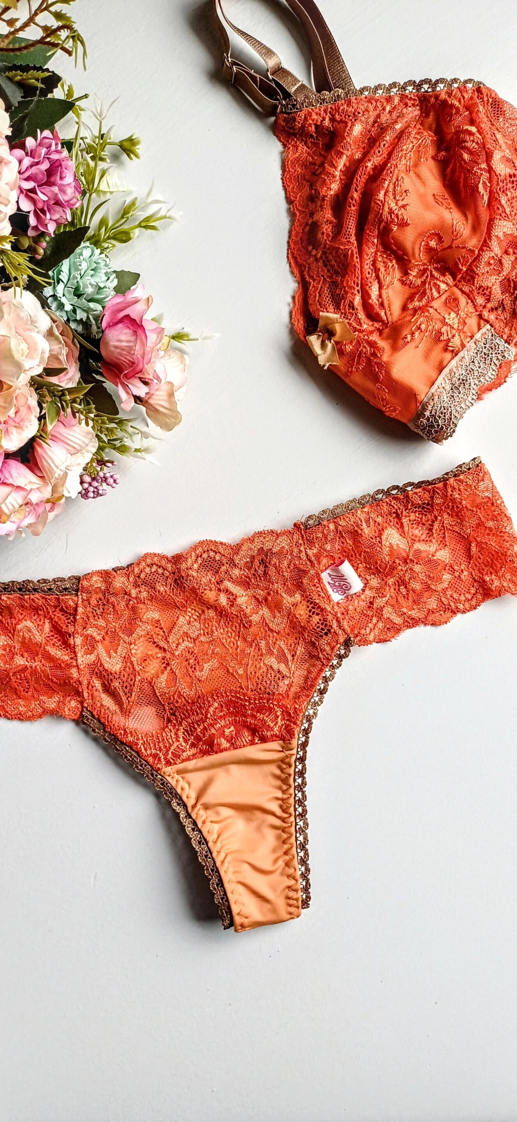 Conjunto confeccionado en puntilla naranja y tul bordado al tono