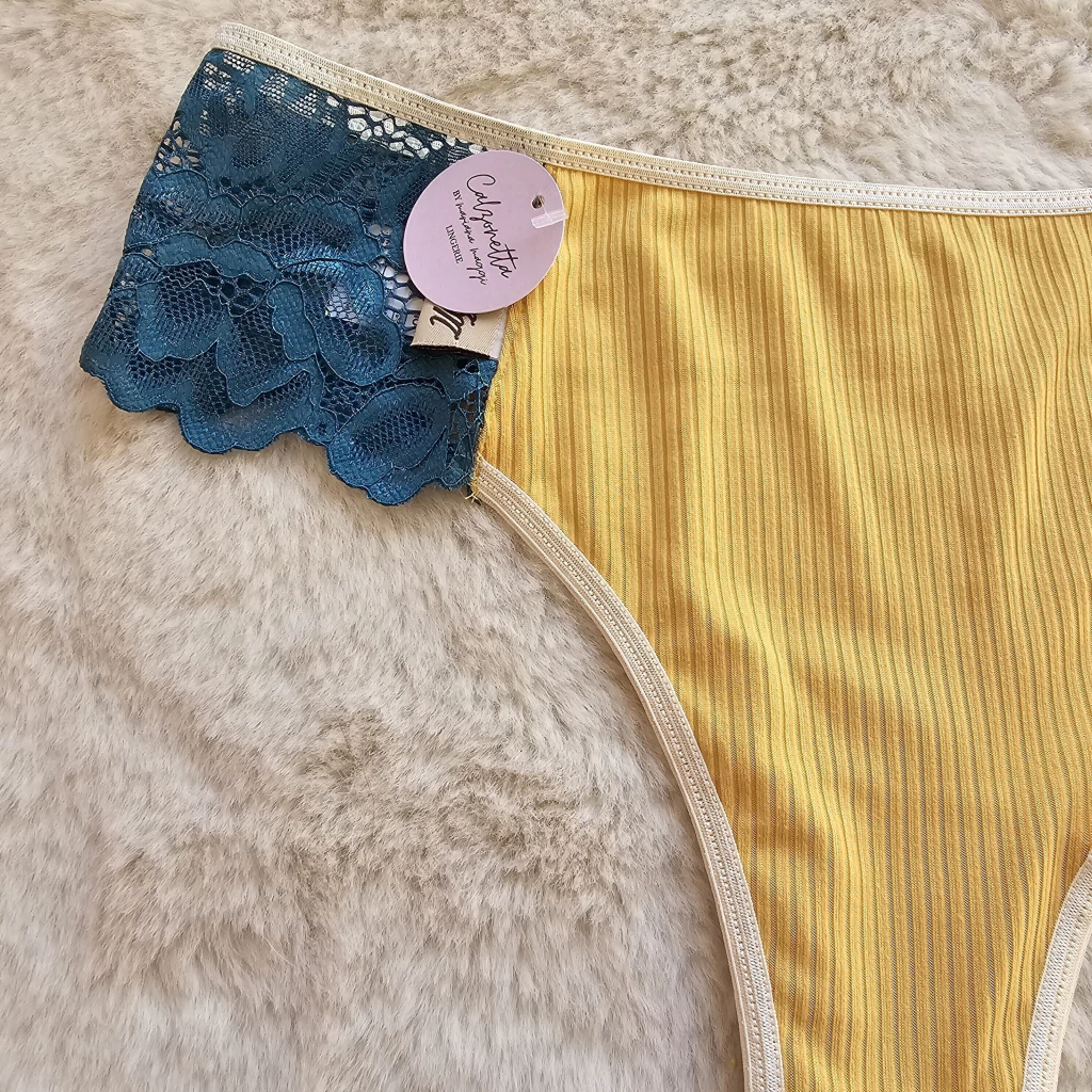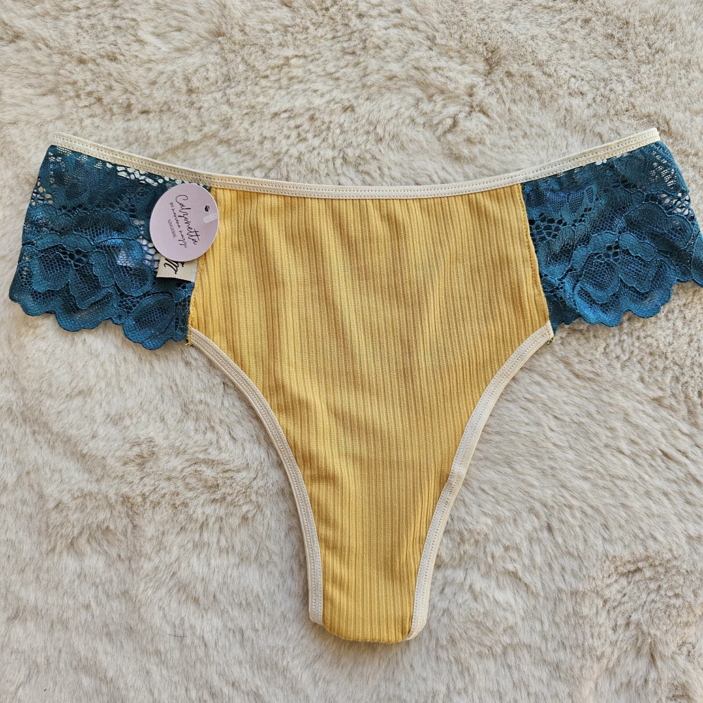 Este elegante culottin en morley color mostaza y detalles de puntilla petroleo en laterales que realzan su diseño único.