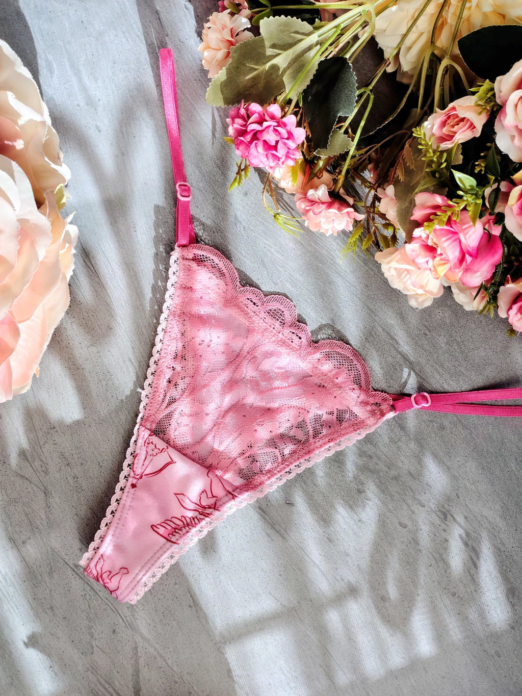 Tanga cola less regulable talle único en modal estampado y puntilla rosa, una prenda que combina comodidad y sensualidad.