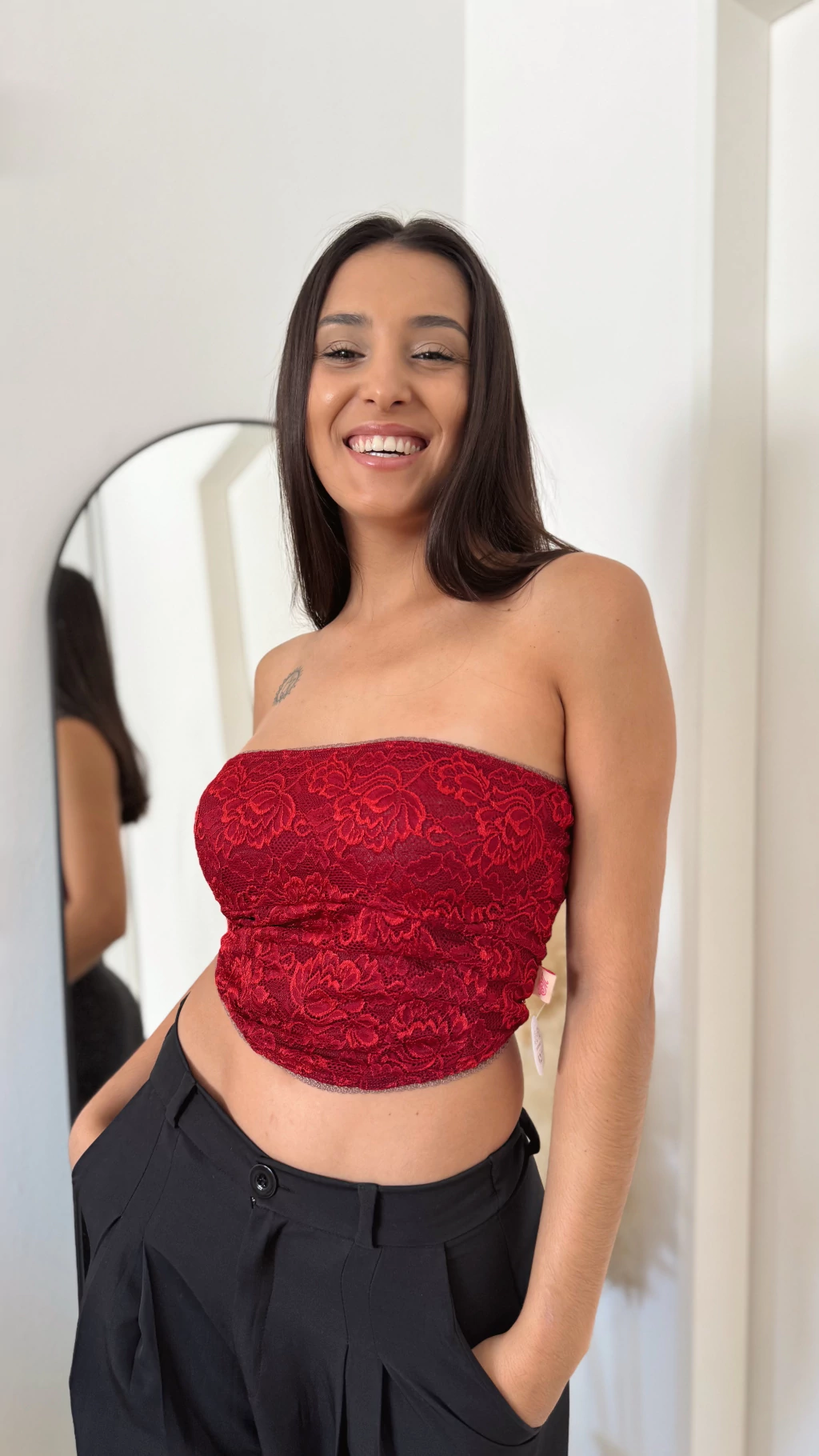 Descubre el Top STRAPLES, diseñado para brindarte comodidad durante todo el día o la noche. Este top está confeccionado en ENCAJE BORDO forrado en su totalidad, la prenda ideal para añadir un toque de elegancia a tu look.